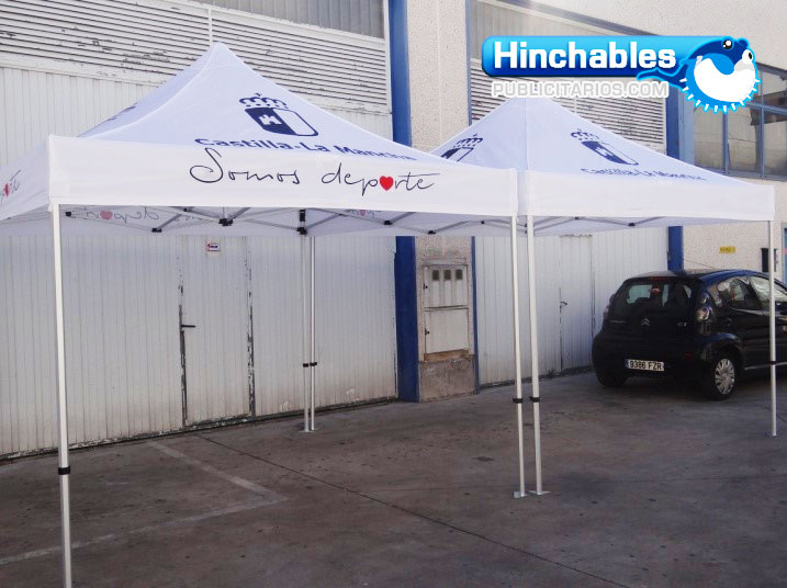 Este conjunto se componía de varias banderas promocionales, las cuales ondeaban en lo alto, y atraían las miradas de todo el público, también de traseras impresas microperforadas, donde el público se sacaba fotos para presumir en sus redes sociales que había estado en el evento. También proporcionamos dos carpas plegables personalizadas en las que los asistentes se podían relajar a la sombra. Y por último no podía faltar nuestro producto estrella, nos encargaron 6 arcos de meta, blancos y con pies azules, donde en la parte superior lucia en grande “CASTILLA LA MANCHA” y el eslogan del evento “Somos deporte”.
