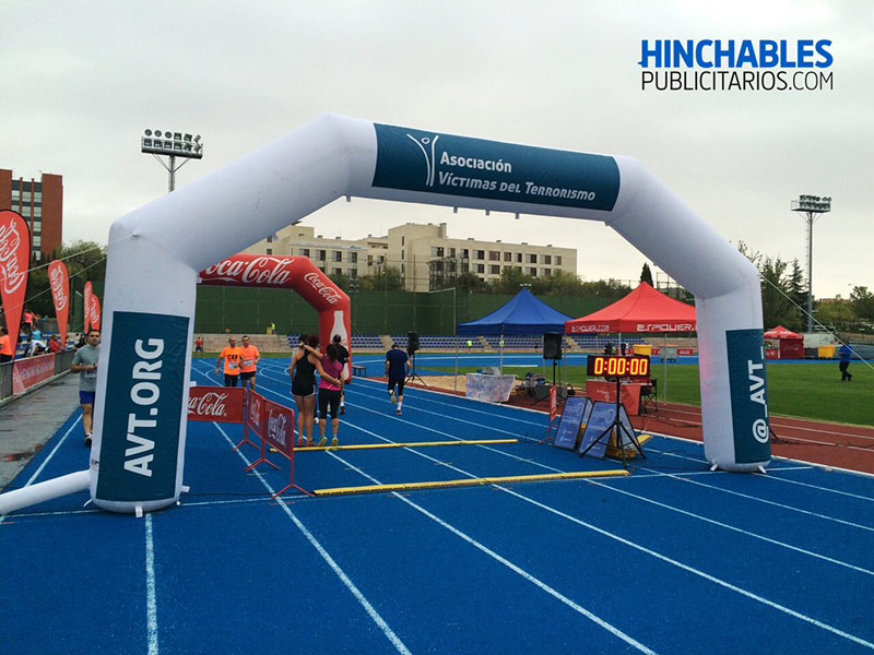 Como fabricante de hinchables publicitarios instalamos un arco de meta hinchable en régimen de alquiler con sus correspondientes pancartas y banderolas publicitarias.