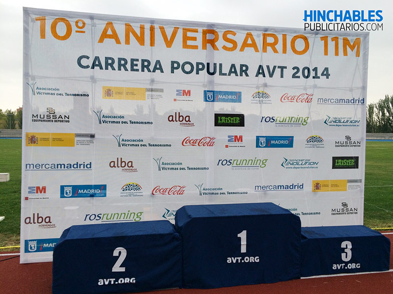 En esta carrera popular no solo producimos los hinchables , también como impresores y fabricantes de impresión digital y carteleria, diseñamos y producimos el podium de la carrera , el photocall de entrada , las lonas publicitarias y graficas que decoraban el evento .